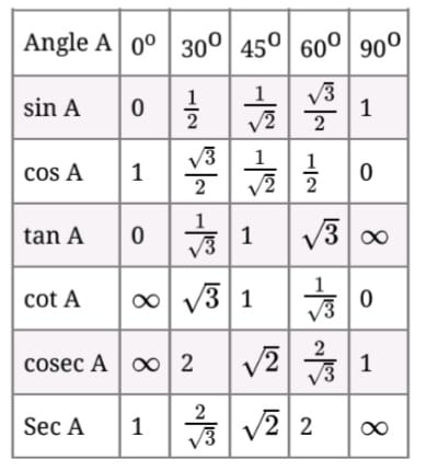 The values of trigonometric ratios for angles 0°, 30°, 45°, 60° and 90°.
