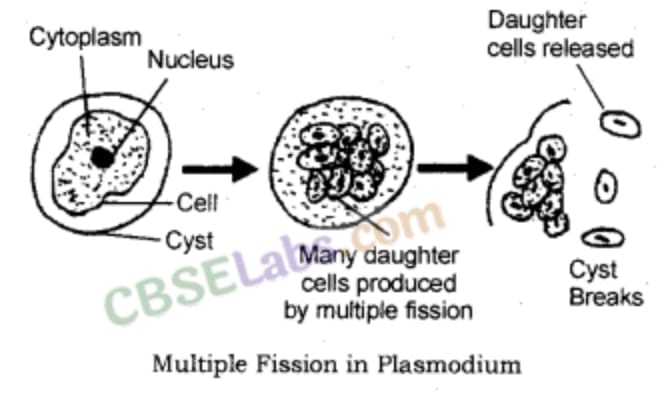 (ii) Multiple Fission: Seen in Plasmodium, (a malarial parasite). In this during unfavourable conditions, the parent cell develops a thick resistant wall around itself forming a cyst. Within the wall, the cytoplasm divides many times to form many plasmodia. When conditions become favourable, the cyst wall breaks and the Plasmodium are released.