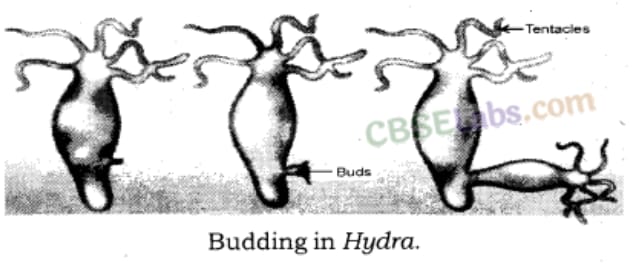 (iii) Budding: Seen in Hydra. Parent Hydra develops a bud at its lower end. This grows in size and finally breaks off to live independently.