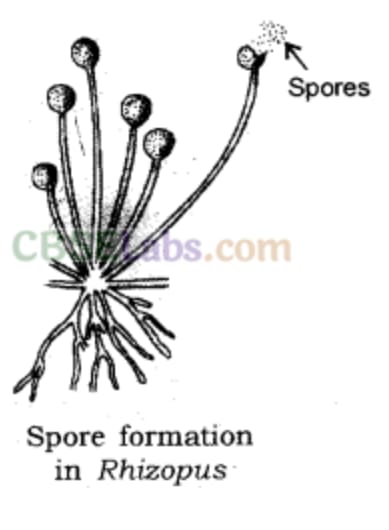 (iv) Spore Formation: Seen in Rhizopus (a fungus). Rhizopus body is made up of thread-like structures called hyphae. The erect hyphae bear sporangia inside which reproductive structures called spores are formed. Spores are asexually reproducing bodies having a thick protective wall. They are produced during unfavourable times and help to tide over the unfavourable environmental conditions. When the spores fall on a suitable medium, each one forms a new individual.