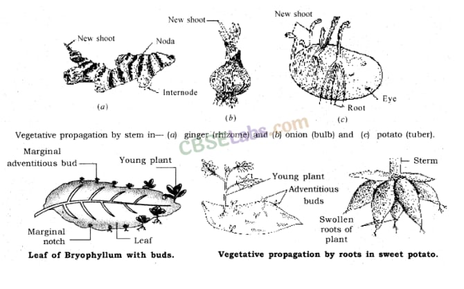 Mint reproduces naturally by roots. Sugarcane, jasmine by stems and Biyophyllum by leaves. In biyophyllum buds are produced in the notches along the leaf margins and when they fall on the soil, they develop into new plants.