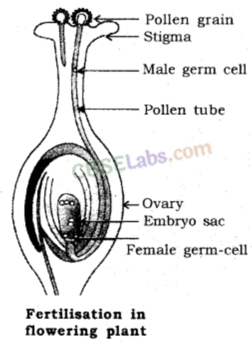 Pollen tube releases two male germ cells inside the ovule, one of them fuses with female germ cell and forms a zygote which grows into the baby plant i.e. embryo, the fusion is known as syngamy. The other male germ cell fuses with two polar nuclei, the process is known as triple fusion. So in flowering plants two fusions take place during fertilisation. It is called double fertilisation.